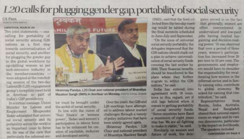 The Labour 20 – L20 is an integral part of the G-20 and represents the interests of workers at the G20 level. The forum tries to bring together trade unionists from the G-20 countries representing 66% of the population and around 75% of Global GDP to discuss the issues concerning the working people and population in general that transcend borders. This year with the Republic of India as the official host for G-20. Bharatiya Mazdoor Sangh, India’s largest Trade Union has been appointed chair to host the L-20.</P> <P style="text-align: justify;">Since the outbreak of the Global Financial Crisis in 2008, the L20 has actively engaged with the inter-governmental processes in and around G-20 in order to ensure a better, more equal, just and sustainable world. Constructive dialogue with governments has been the key element towards achievement of goals desired. Over time the L-20 has tried to connect with other engagement groups, specially the Business-20 of which workers form an essential component.